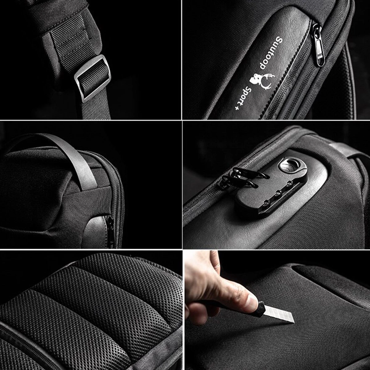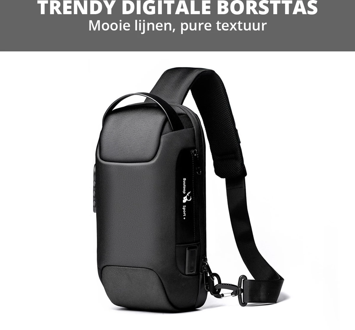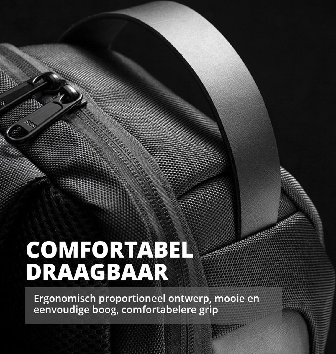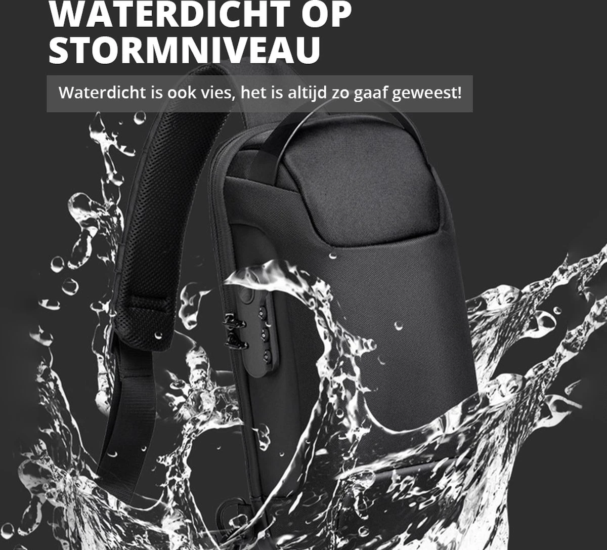 - Kenmerken: grote capaciteit, waterdicht, waterafstotend, anti-diefstal, opladen via USB