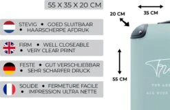 De koffer beschikt over een transparante voorkant waarin je een print kan plaatsen en op ieder gewenst moment kan verwisselen. Hierdoor kan je het naar eigen wens personaliseren en kan je jouw koffer gemakkelijk herkennen. Jouw koffer zal er dan ook tussenuit springen op de bagageband. Wij stoppen de print speciaal voor jou de eerste keer erin zodat jouw koffer ready-to-go is!