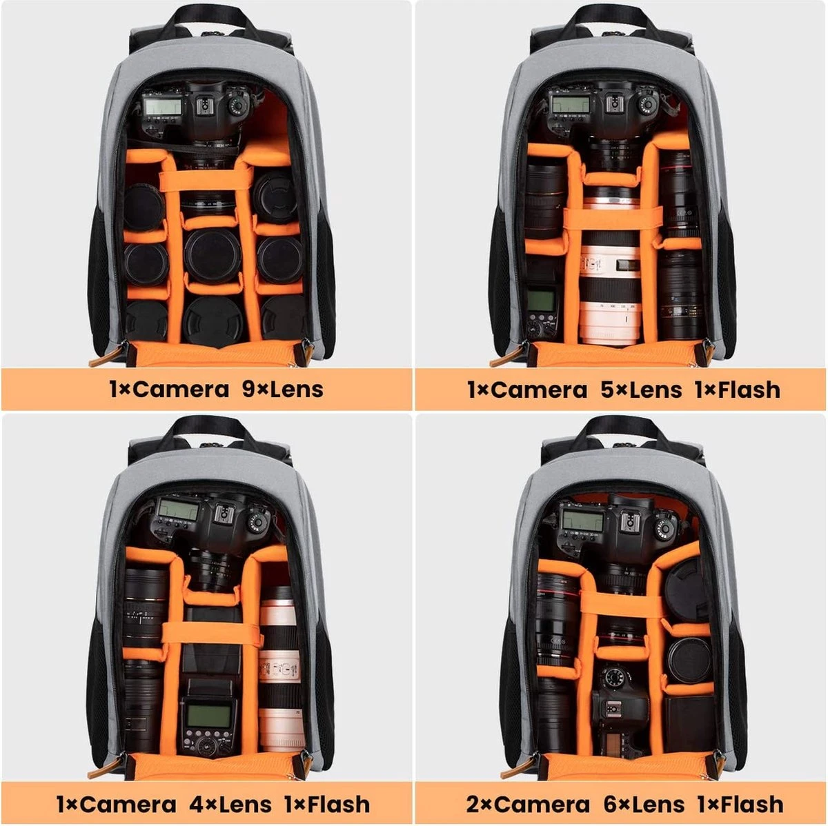 - Rugzak voor fotografen:De 8 gevoerde, losse beschermstroken die ook op een andere manier kunnen worden geordend, bieden een goede bescherming voor je camera en accessoires. Het statief kan aan de onderkant van de rugzak worden bevestigd.